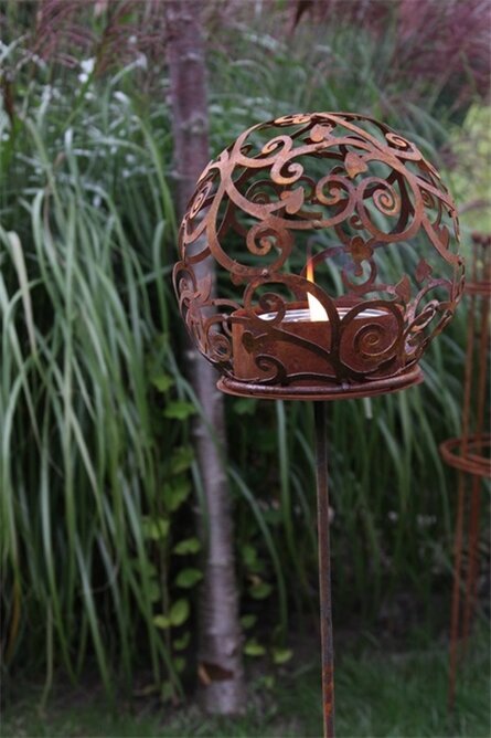Bilden på Köpstaden.se visar en Marschall Blomklot från Eldgarden, som står stolt i en trädgårdsmiljö. Denna sfäriska marschallhållare är uppbyggd av intrikat mönstrade metalldetaljer, vars rostiga finish ger produkten en naturligt åldrad och vintage känsla. Ljuset som avges genom de utsmyckade håligheterna kastar intressanta skuggor, vilket skapar en varm och inbjudande atmosfär.