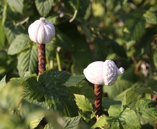 De dekorativa kapslarna är placerade på varsin metallstång, som syns delvis täckta av rostliknande patina. Detta bidrar till deras jordnära framtoning och gör att de smälter in på ett harmoniskt sätt i den omgivande växtligheten. De gröna bladen runtomkring tillför en vacker kontrast mot de ljusare dekorelementen.