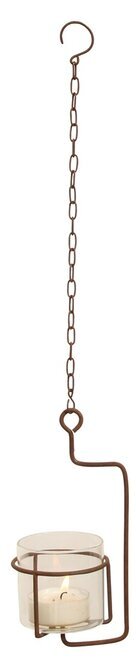 Ljuslyktan kännetecknas av en robust metallkonstruktion med en antikbrun finish. Metallen är formad till en böjd ställning som smidigt övergår i en kedja, vilket möjliggör att lyktan kan hängas upp i olika miljöer, såsom uterum eller trädgård. Kedjan avslutas med en krok, vilket förenklar upphängningen och gör den lätt att placera ut på olika ställen.