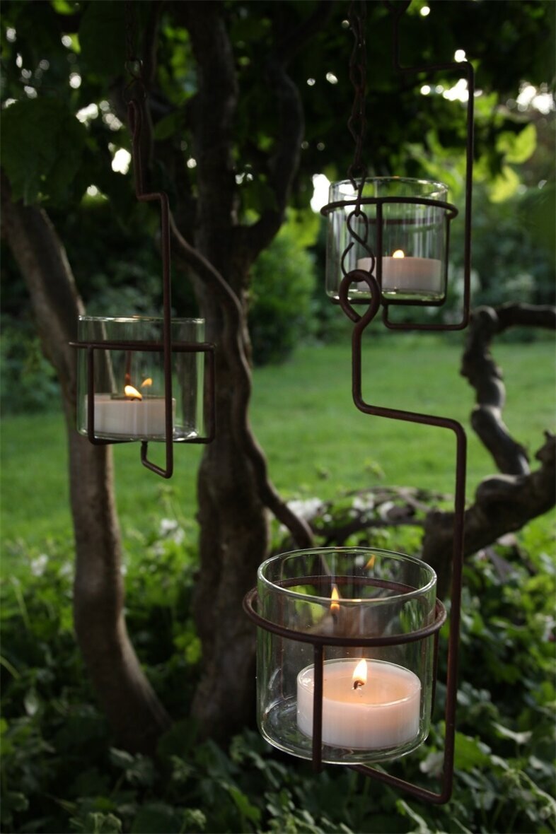 Vacker hängande ljushållare tillverkat av rostigt järn med glas för värmeljus. Läs mer