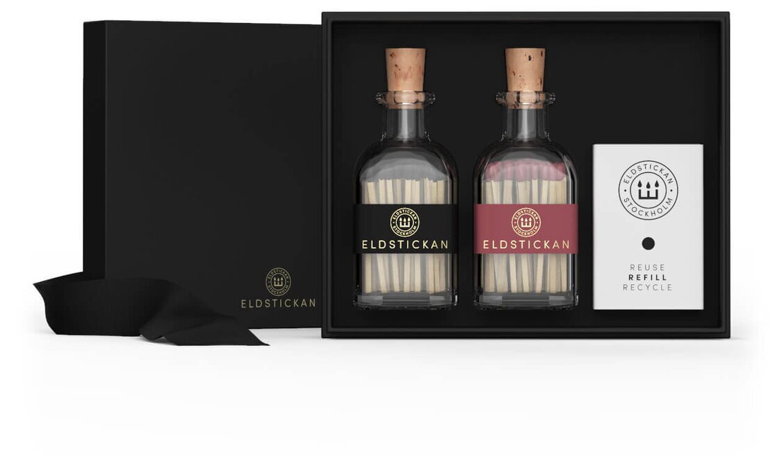 Presentask innehållande 2 stycken tändsticksflaskor samt en refillask med tändstickor från Eldstickan. Läs mer