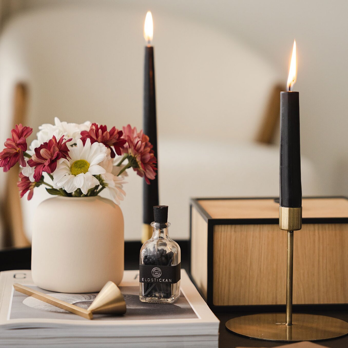 Mittemot blomkrukan ser vi två smala, svarta ljus uppställda i eleganta mässingsljusstakar. Ljusens flammor brinner klart och kastar ett mjukt ljus över hela scenen, vilket skapar en inbjudande atmosfär. Mässingshållarna har en enkel men robust design, vilket ger en känsla av tidlöshet och funktionalitet.