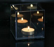 Motivets fokus är en fyrkantig, transparent kub med tydliga, raka linjer som ger ett elegant och stilrent intryck. Kuben är gjord av ett glasliknande material som har en lätt rökgrå nyans, vilket bidrar till en subtil mystik och djup i designen. Inuti kuben finns det en tänd värmeljus – dess flamma kastar ett varmt, mjukt sken som reflekteras mot de polerade innerväggarna. Denna reflektion skapar en nästan oändlig spegelbild av ljuset, vilket bidrar till produktens namn och förstärker den visuella effekten av djup och oändlighet.