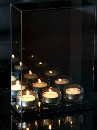 Ljushållaren har en rektangulär form och är placerad mot en mörk bakgrund, vilket förstärker ljusen och deras varma sken. Detta samspel mellan ljus och skugga skapar ett lugnt och inbjudande intryck som fungerar perfekt i både modern och traditionell inredning. Optiken kan förknippas med något som går bortom bara funktionalitet, nämligen hur ljuset formas och förändras beroende på perspektivet och vinkeln av var ljushållaren betraktas.