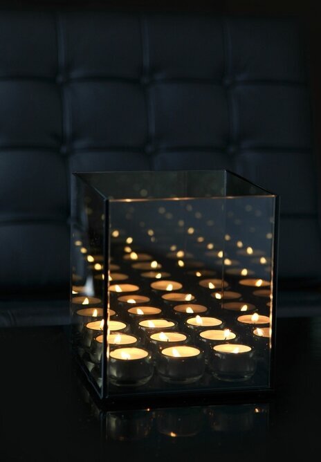 I denna ljuslykta som har plats för nio värmeljus kan man se oändligt många fler ljus då glaset reflekterar ljuset. Läs mer