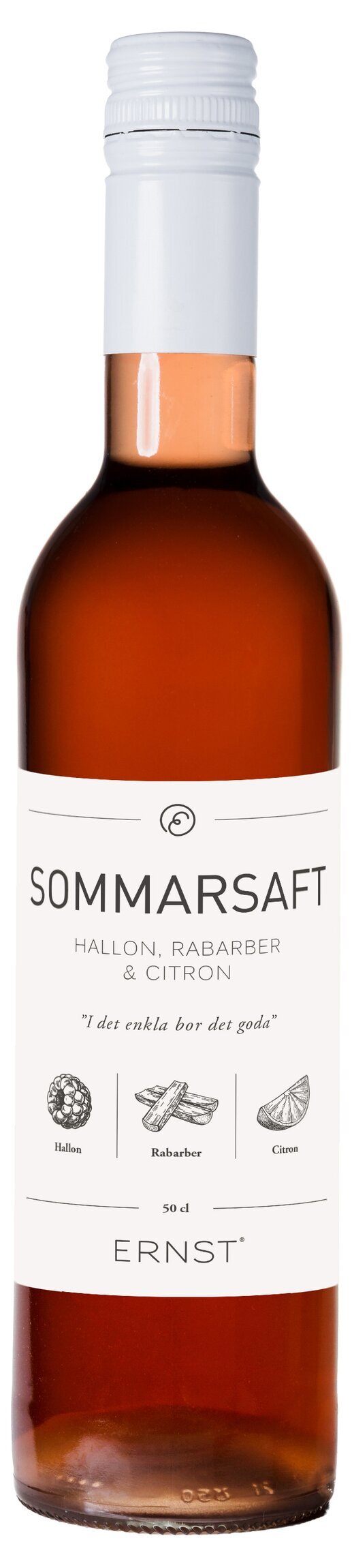 Sommarsaft med smak av hallon, rabarber & citron från Ernst Skafferi. Flaskan innehåller 50 cl, Pastöriserad. En flaska ger ca 2.5 liter färdig saft. Spädning: 1+4 med vatten eller kolsyrat.