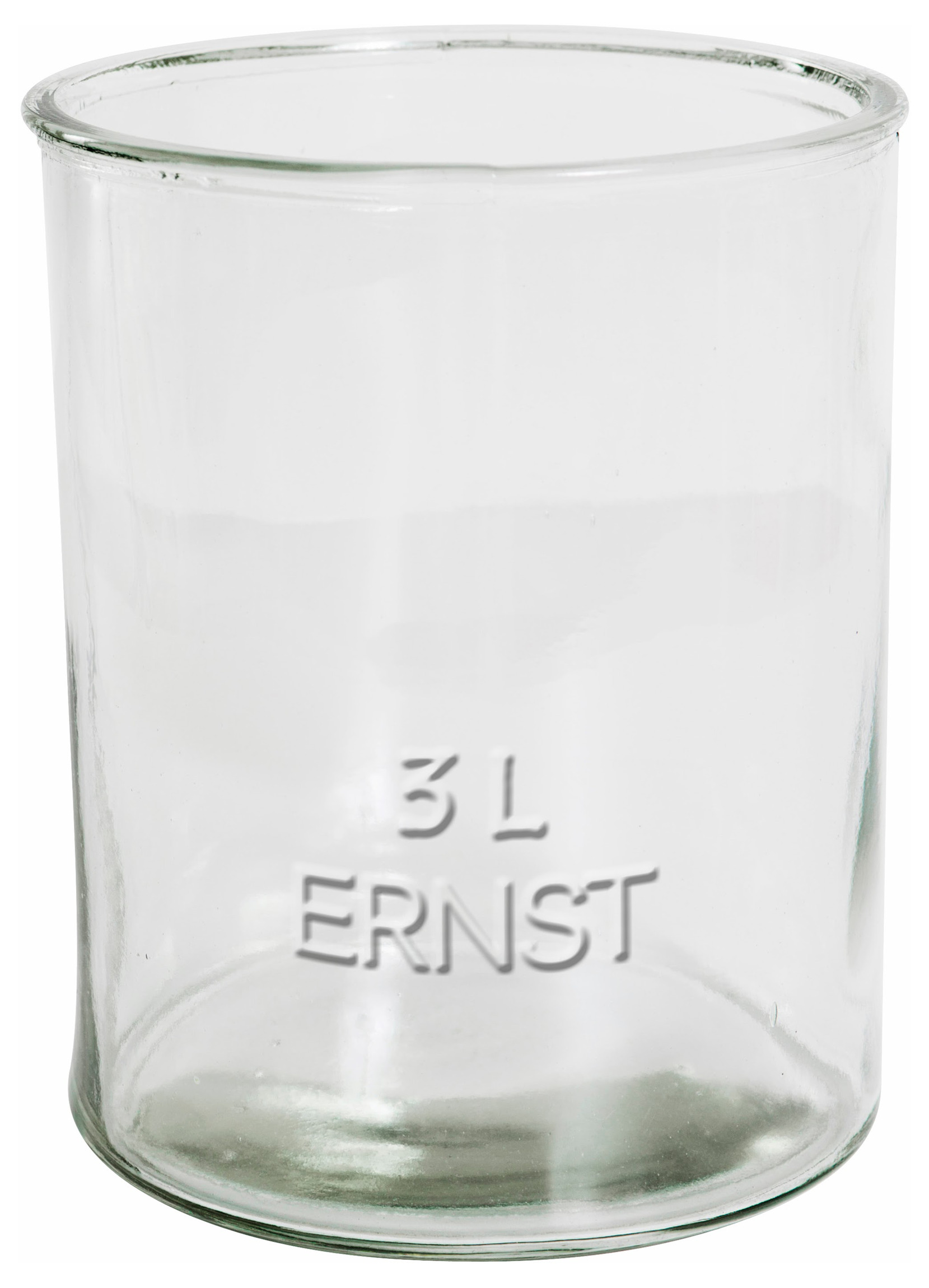Glaskrukan är minimalistisk i sin design, utan onödiga dekorationer, vilket ger den ett tidlöst utseende. Den raka formen gör den fylld av praktiska användningsområden; perfekt för att förvara torrvaror i köket som pasta, ris eller flingor, men den kan lika gärna användas för att presentera vackra blommor eller gröna växter. På framsidan av glaskrukan ser vi en diskret märkning som anger volymen, 3 liter, samt varumärket Ernst, präglat i glasmassan. Detta ger en känsla av autenticitet och klassisk funktionalitet.
