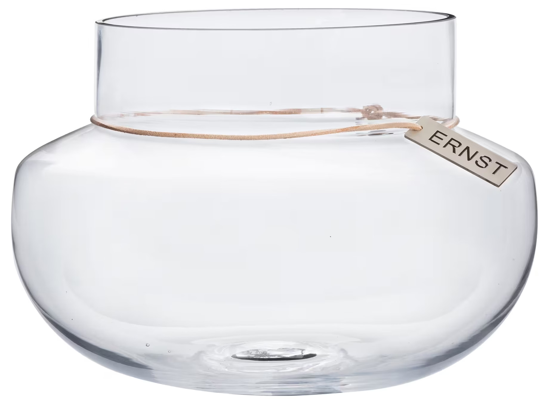 Vacker vas i klarglas med läderband samt metallbricka graverat med Ernst. Mått: Ø 22 x 15 cm. Läs mer