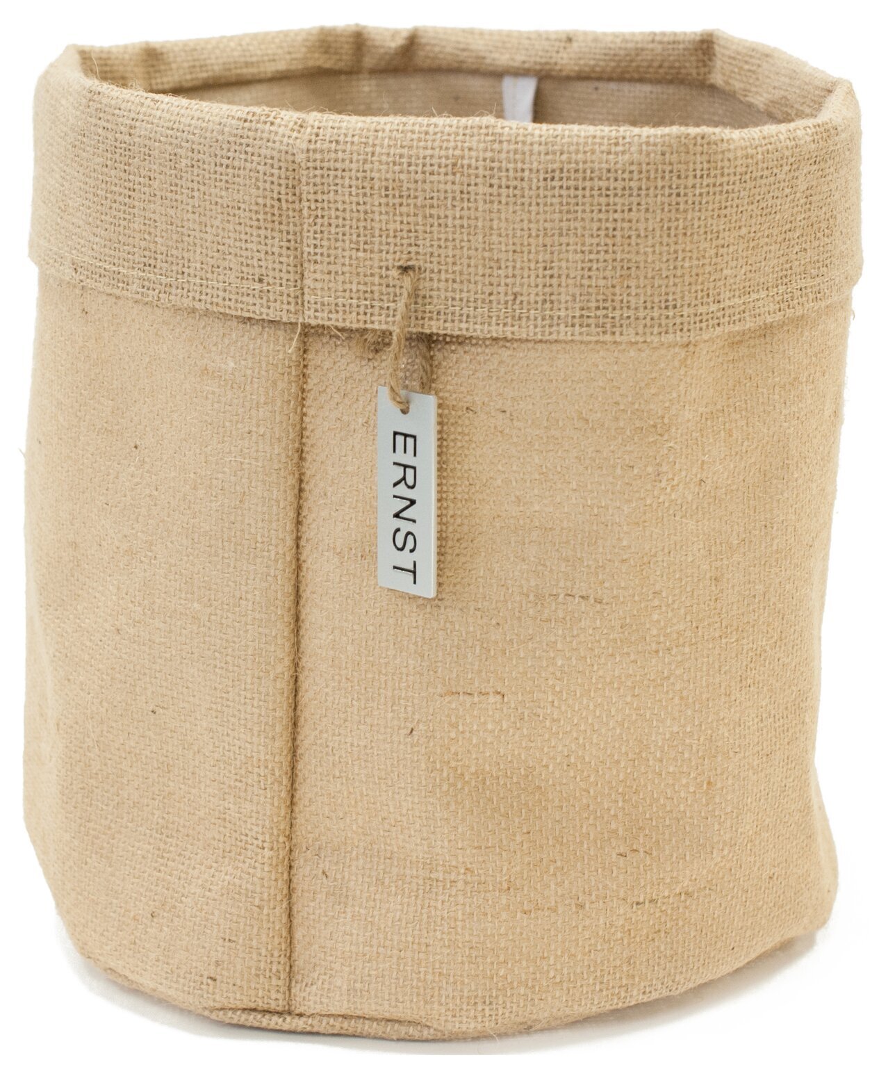 På utsidan av korgen hänger en diskret etikett med varumärket Ernst. Etiketten är placerad på ett sådant sätt att den enkelt kan ses utan att vara påträngande. Den är fäst med en smal snodd som harmonierar väl med jutevävens naturliga look.