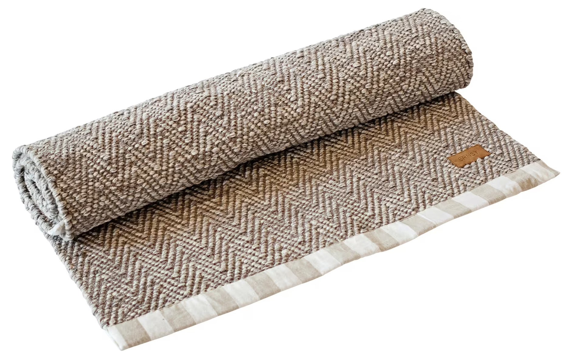 Texturen på ytan har en intressant, upphöjd struktur som påminner om ett klassiskt zigzag- eller chevronmönster. Detta mönster är både stilrent och tidlöst, vilket gör mattan lämplig för olika inredningsstilar. På den vänstra sidan, där mattan är hoprullad, framhävs den täta vävstrukturen som talar för dess kvalitet och hållbarhet. Den robusta känslan antyder att mattan är lämplig för både högre trafikytor i hemmet, såsom hallar eller vardagsrum.
