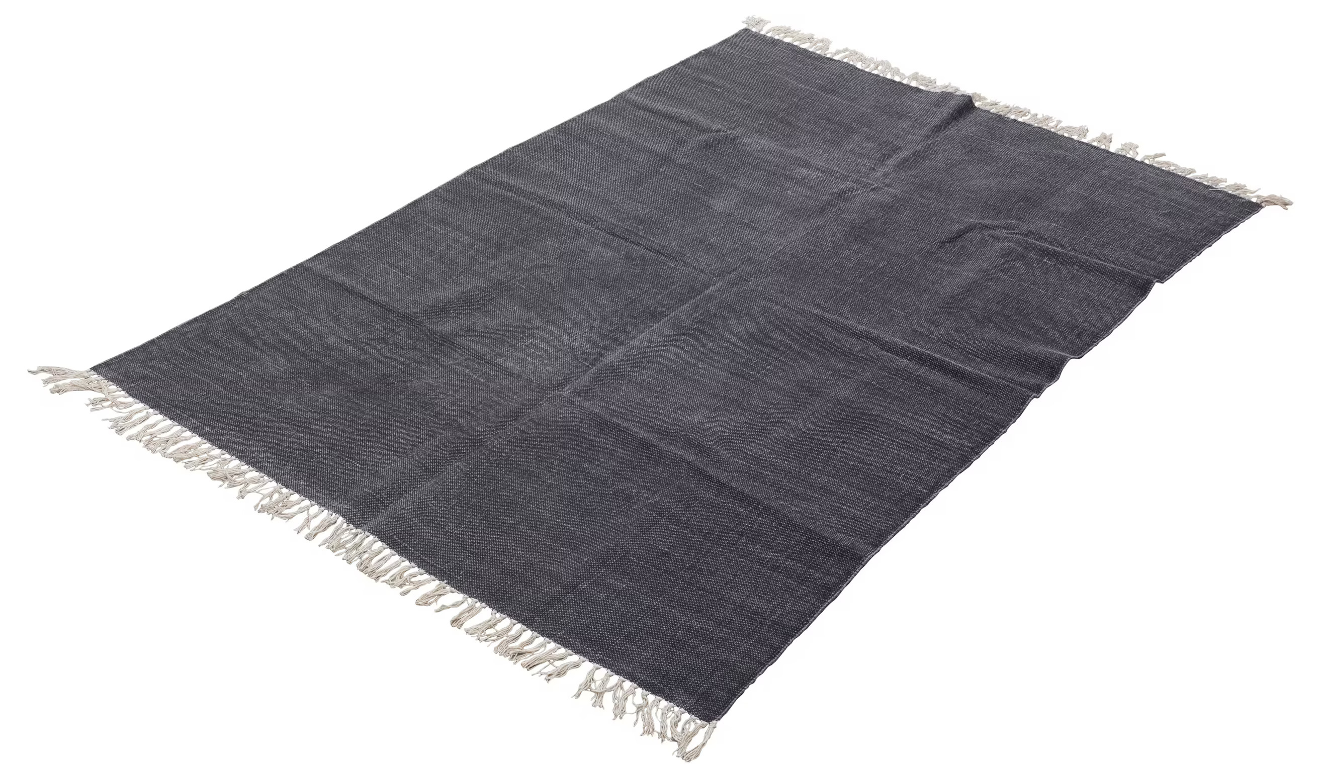 Fransarna på kortsidorna är en ljusare nyans, nästan vit, vilket ger en fin kontrast till mattans dämpade färg. Dessa fransar bidrar med en mjukhet och ger ett balanserat intryck mot det något robusta helhetsintrycket av den grå ytan. Designen är enkel men genomtänkt, och den försäkrar att mattan kan fungera i många olika typer av interiörer, från det moderna till det mer traditionella hemmet.