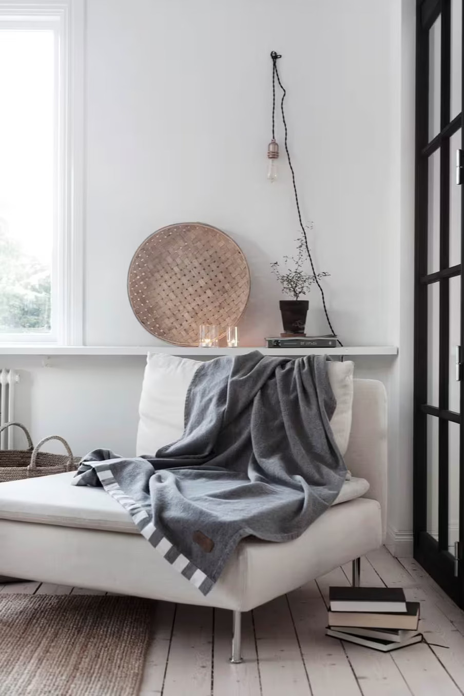 Runt den avbildade pläden från Ernst syns andra noga utvalda designelement. Till höger om sittmöbeln står en stapel böcker vars omslag bär olika neutrala toner, bidragande till den balanserade färgpaletten i rummet. Sedan ser vi en svartglaserad dörr med glasrutor, vilket tillför en elegant och modern kontrast till den övergripande ljusa miljön. Golvets träplankor, målade i en vit nyans, förstärker intrycket av rummet som luftigt och välkomnande.