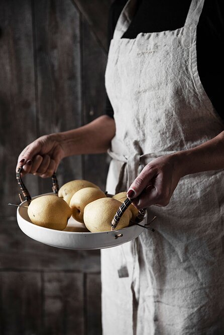 Personen i bilden håller i en vit metallskål försedd med handtag av mörkt trä. I skålen ligger flera gula citroner, vars klara färg kontrasterar mot den mörka bakgrunden och de neutrala tonerna i förklädet. Skålens enkla, men ändå eleganta form förstärker det stilrena och praktiskt orienterade intrycket som hela arrangemanget ger. Handtagen av trä ger en naturlig känsla, kompletterande det råa linnet.