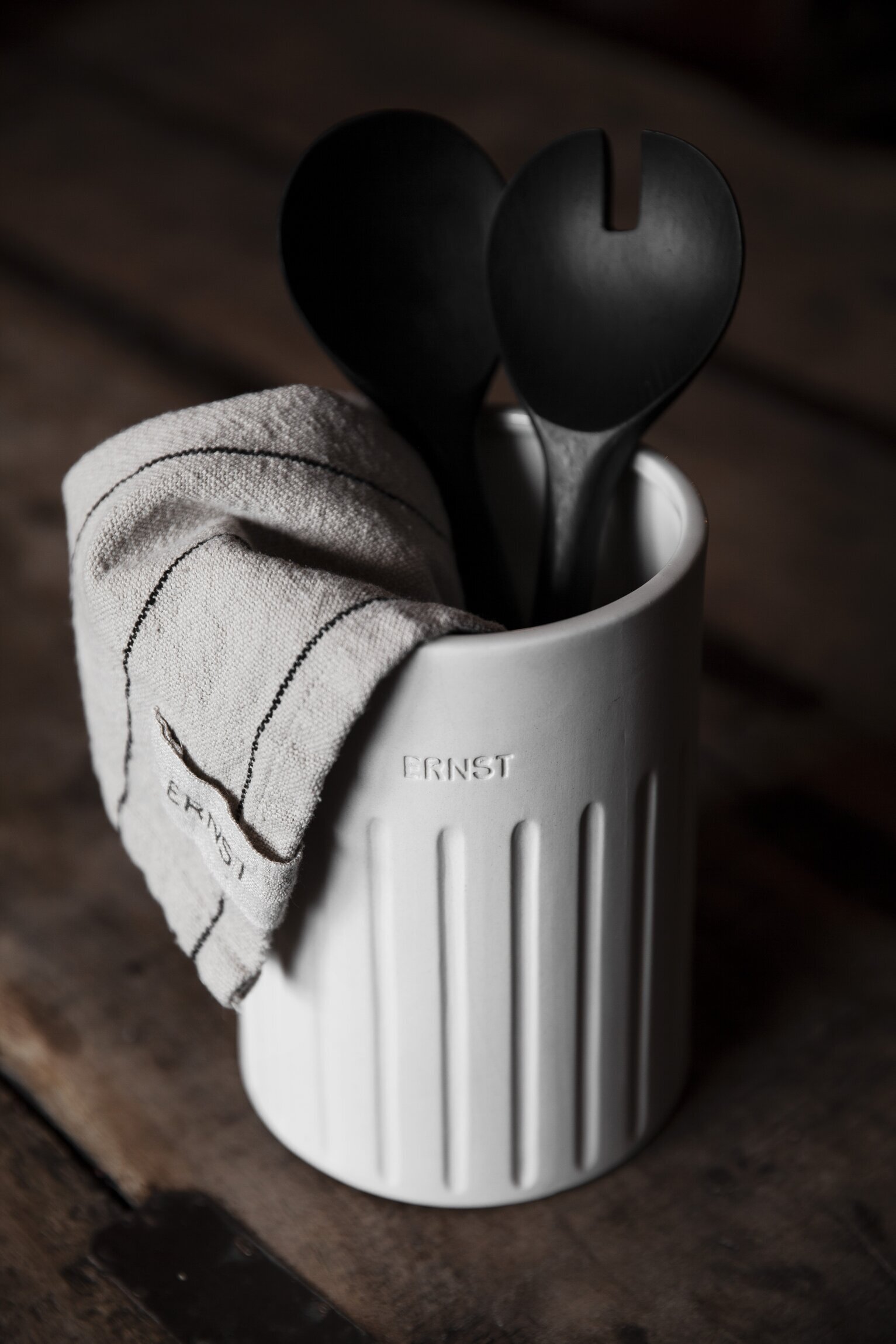 Framför vasen står en kökshandduk i en naturlig textil. Handduken har flera tunna linjer som löper i horisontell riktning, vilket kontrasterar mot vasens vertikala mönster. Handduken ligger nonchalant draperad över vasens kant, vilket adderar en känsla av hemtrevlig spontanitet i bilden. På handduken kan man också se att varumärket Ernst är diskret broderat, vilket förstärker den högkvalitativa känslan produkten utstrålar.