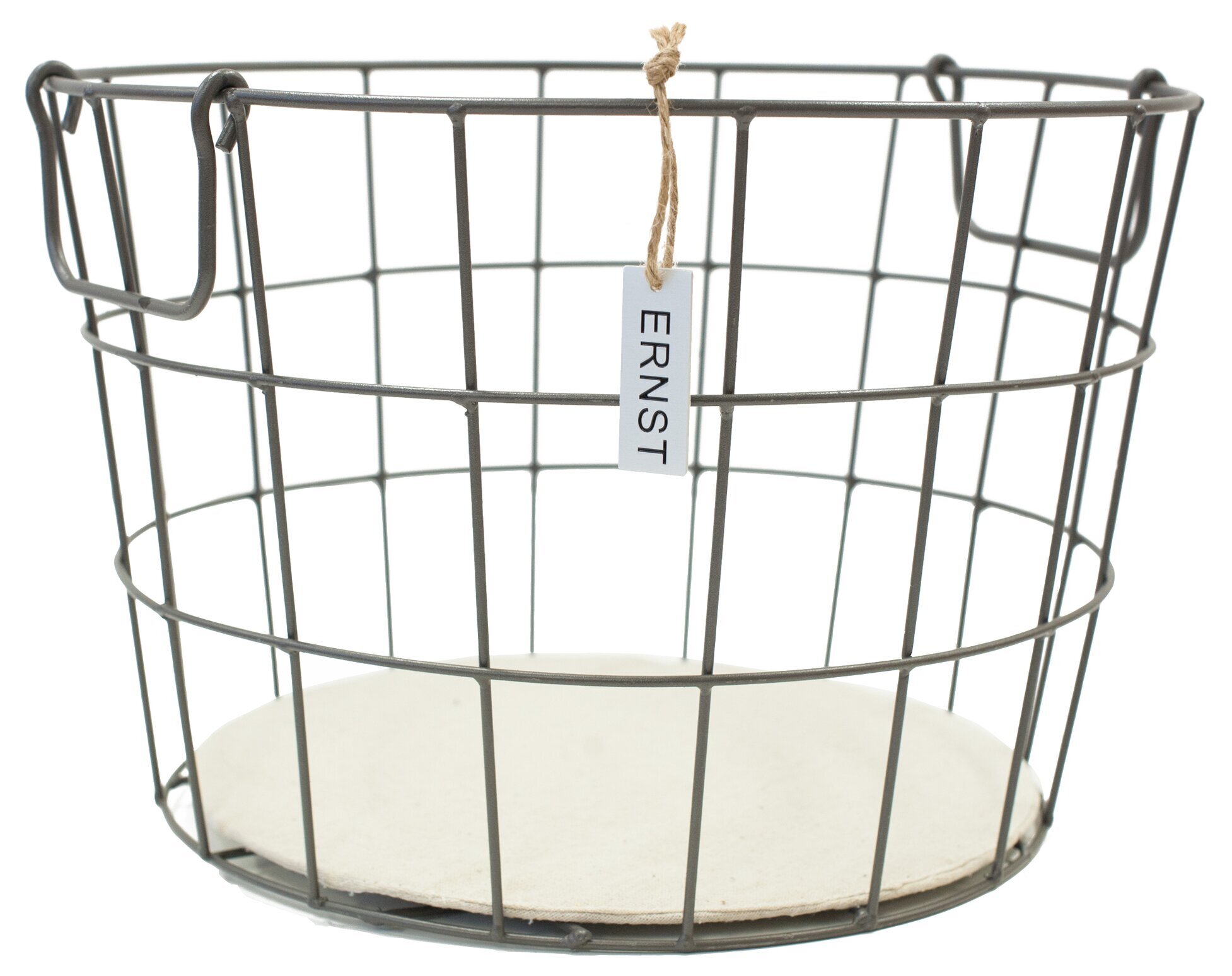 Bilden visar en rund förvaringskorg av metall som ingår i Köpstaden.se:s breda sortiment av hushållsprodukter. Denna specifika korg, från varumärket Ernst, har en minimalistisk design som är både funktionell och visuellt tilltalande. Korgen är tillverkad av metalltråd, vilket ger den en robust och stabil struktur utan att kompromissa med dess lätthet.