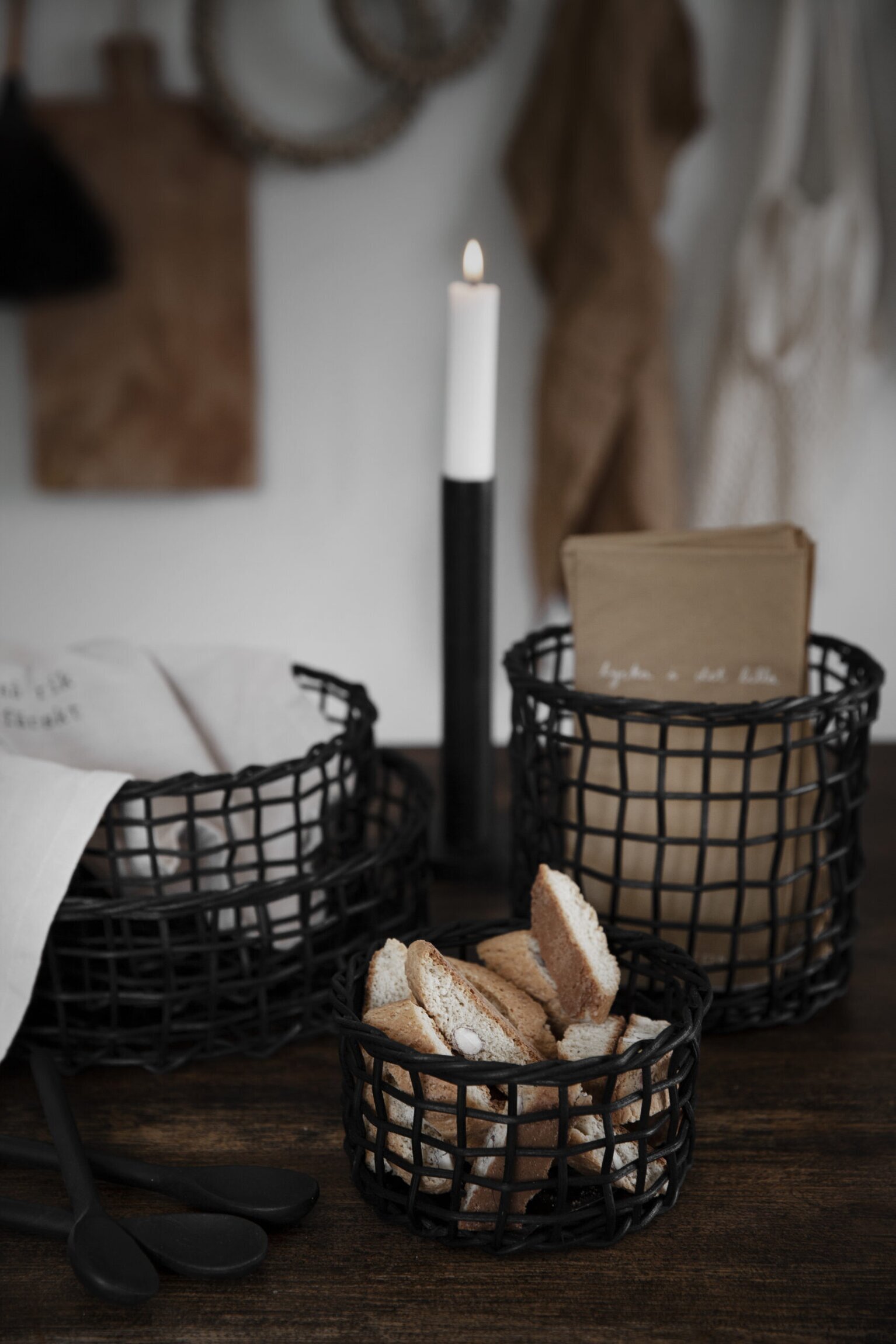 Bakgrundsmiljön kompletteras av ett högt, smalt ljus i en mörk ljusstake som står elegant i bakgrunden. Ljuset bidrar till att sätta en stämningsfull atmosfär, vilket kan inspirera till användning av dessa korgar vid middagsbjudningar eller andra sociala tillställningar. Ljuset och bordets mörka ton samverkar för att ge en varm och inbjudande känsla.