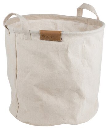Bilden visar en stilren och praktisk tygförvaring från varumärket Ernst, som finns tillgänglig hos Köpstaden.se. Denna runda förvaringskorg mäter 30 x 30 cm och har en mjukt cremefärgad nyans. Materialet ser ut att vara robust och hållbart, vilket framhävs av den släta, men ändå något böljande texturen. Korgen är designad för att enkelt passa in i olika miljöer, oavsett om det handlar om ett modernt hem eller en mer traditionell inredning.