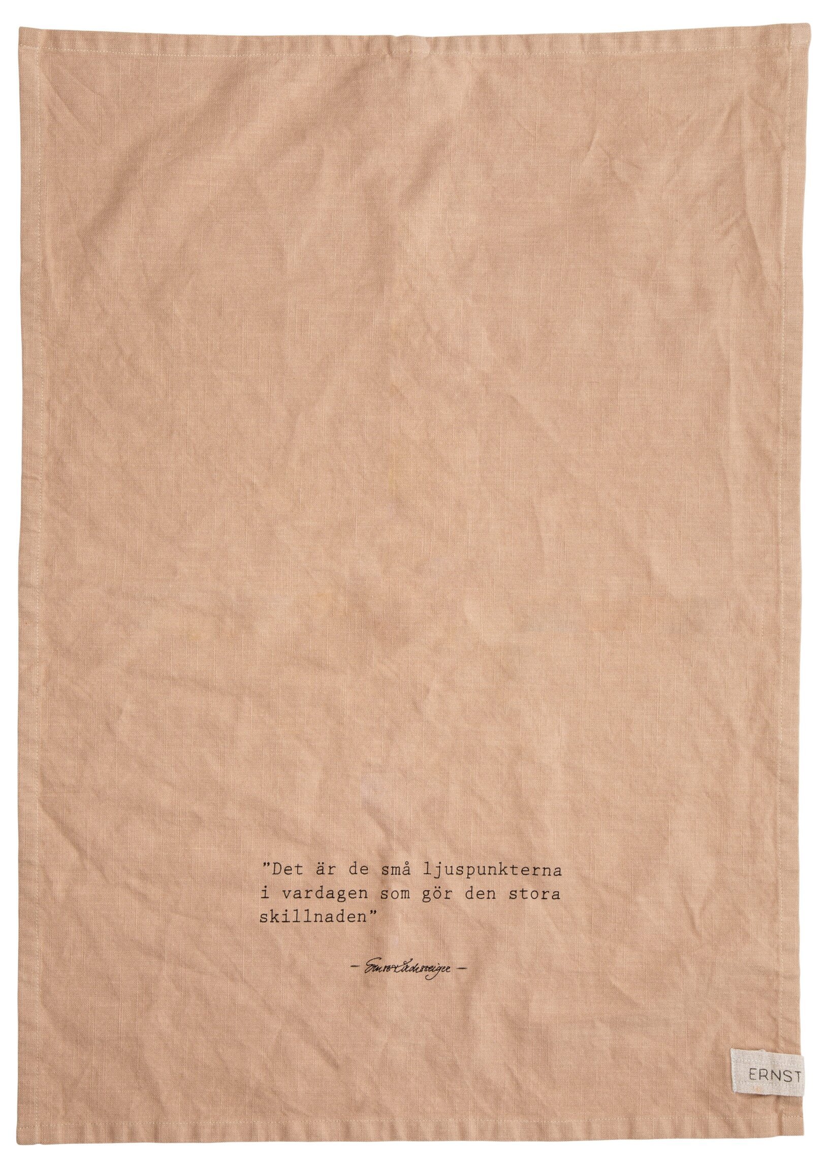 I mitten av handduken står ett citat tryckt i svart: "Det är de små ljuspunkterna i vardagen som gör den stora skillnaden," tillsammans med en signatur av Ernst Kirchsteiger. Texten placeras diskret men centralt, för att locka blicken utan att dominera den övergripande estetiken av produkten.