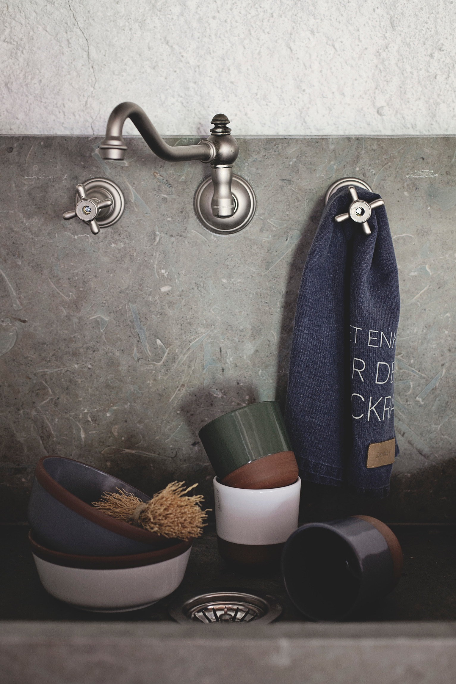I den rymliga diskhon, tillverkad av samma material som väggen, ligger flera keramiska skålar och koppar staplade på varandra i en avslappnad ordning. Dessa är i olika jordnära nyanser; från djupt grönt och mörkt brunt till klassiskt vitt. En enkel men effektiv diskborste med naturliga borst ligger i en av skålarna och förstärker det organiska och autentiska uttrycket.