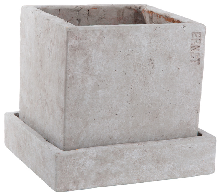 På bilden syns en fyrkantig kruka med ett tillhörande fat, båda i en neutral grå nyans. Krukan och faten är tillverkade av robust betong, vilket ger dem en gedigen och stabil känsla. Ytan är grov och något ojämn, vilket bidrar till ett något organiskt intryck, där små variationer i färg och textur bryter upp dess annars enkla gestalt. Produkten, som är en del av Ernst-kollektionen, finns tillgänglig hos Köpstaden.se, en butik som erbjuder ett brett spektrum av allsidiga produkter för hemmet.