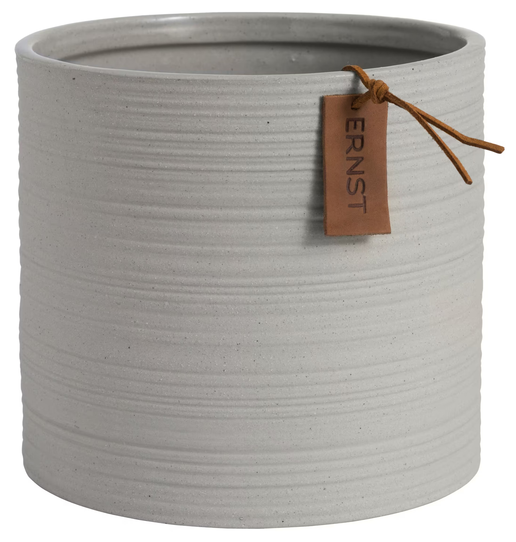 På bilden syns en ljusgrå kruka från varumärket Ernst, tillgänglig hos Köpstaden.se. Krukan är cylindrisk i form och har en jämn och slät yta som bryts upp av subtila, horisontella linjer. Dessa linjer ger en textur som både är diskret och samtidigt tillför en känsla av djup. Färgen är en mjuk ljusgrå ton som smidigt kan matchas med många olika inredningsstilar och miljöer.