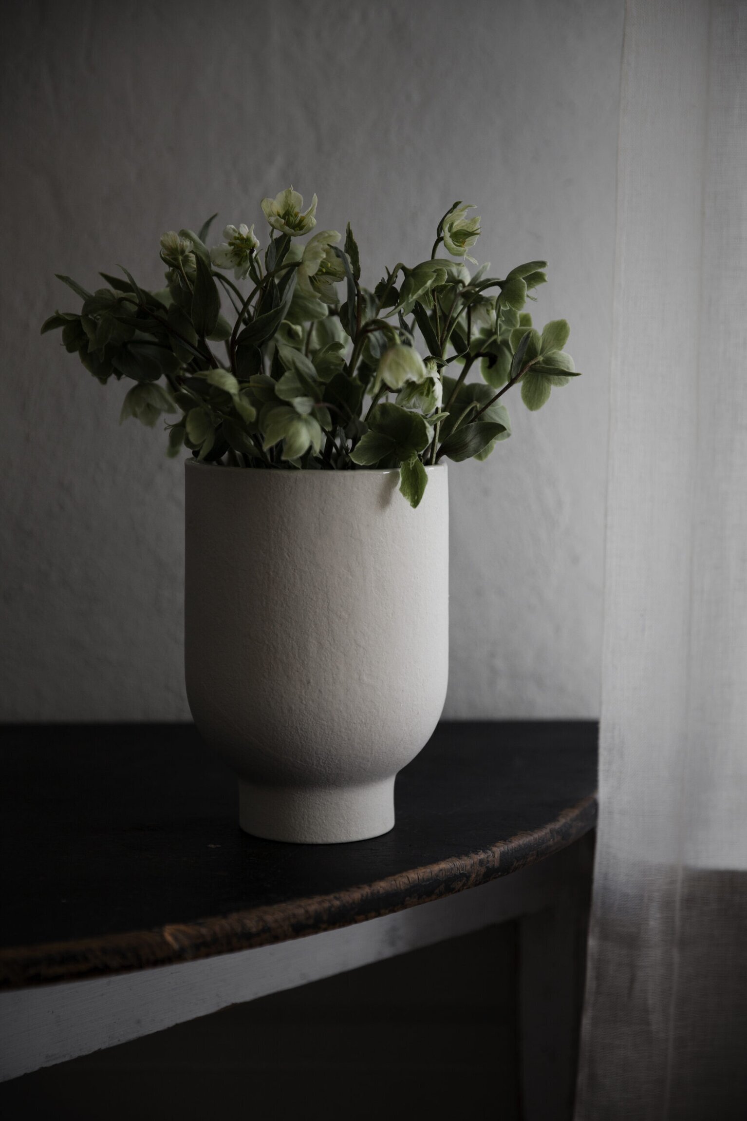 Vacker naturvit kruka på fot i stengods med glaserad insida, finns i flera storlekar.