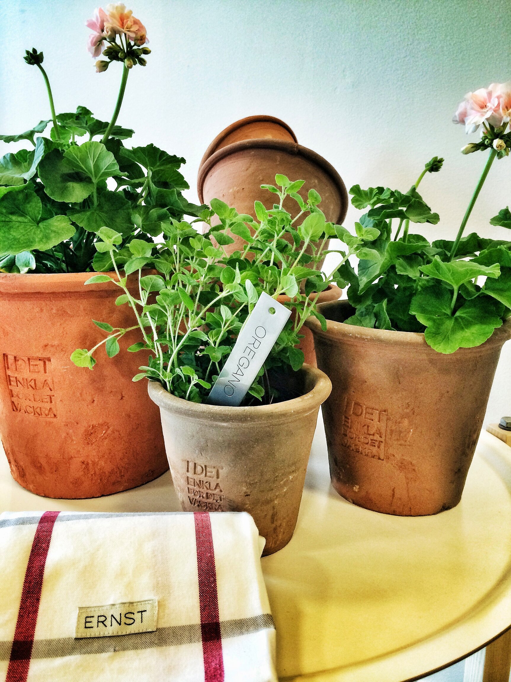 I den första krukan syns en livfull pelargon, vars blomma lyser i ljusrosa nyanser. Den frodiga gröna lövverken som omger blomman skapar en fin kontrast mot den starka terrakottan. Bredvid pelargonen står en mindre kruka med färsk oregano, vars frodiga bladverk bidrar med en doft av fräscha örter till kompositionen. En vit etikett, fäst vid växten, identifierar den som oregano och bidrar med ett modernt element till arrangemanget.