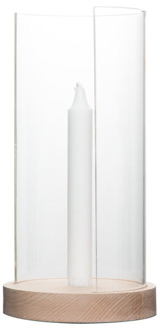 Träfoten, som stöder hela strukturen, är gjord av vackert ådrat trä, vilket ger en organisk och naturnära känsla till lampetten. Träet är behandlat för att ge en slät yta, samtidigt som den naturliga strukturen framhävs. Formen på träfoten är rund, vilket harmoniserar med glasets cylindriska form, och den platta ytan ger en stadig bas för glascylindern.