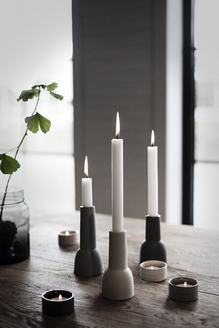 Vacker mörkgrå ljusstake i stengods, passar till kronljus. Finns i flera färger samt storlekar.