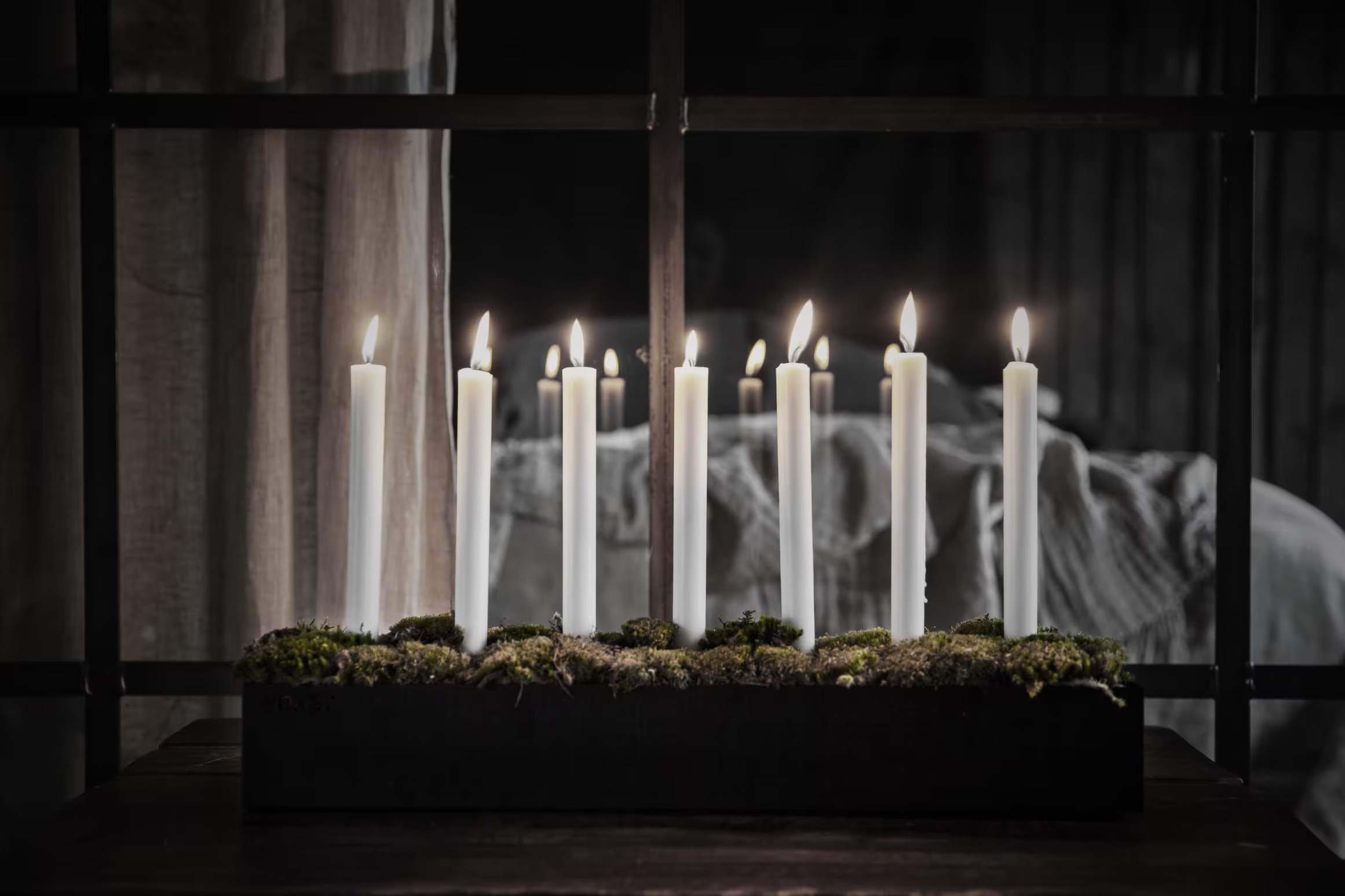 Bakom ljusstaken ser vi ett mörkt fönster, delvis täckt av ett genomskinligt tyg som låter ljuset från ljusen reflekteras och sprida sig i rummet. Gardinerna i bakgrunden faller i mjuka veck och ger en textur som förstärker den hemtrevliga atmosfären. Reflektioner från ljusens lågor syns i fönstrets glas, vilket ger en subtil djupverkan till kompositionen.