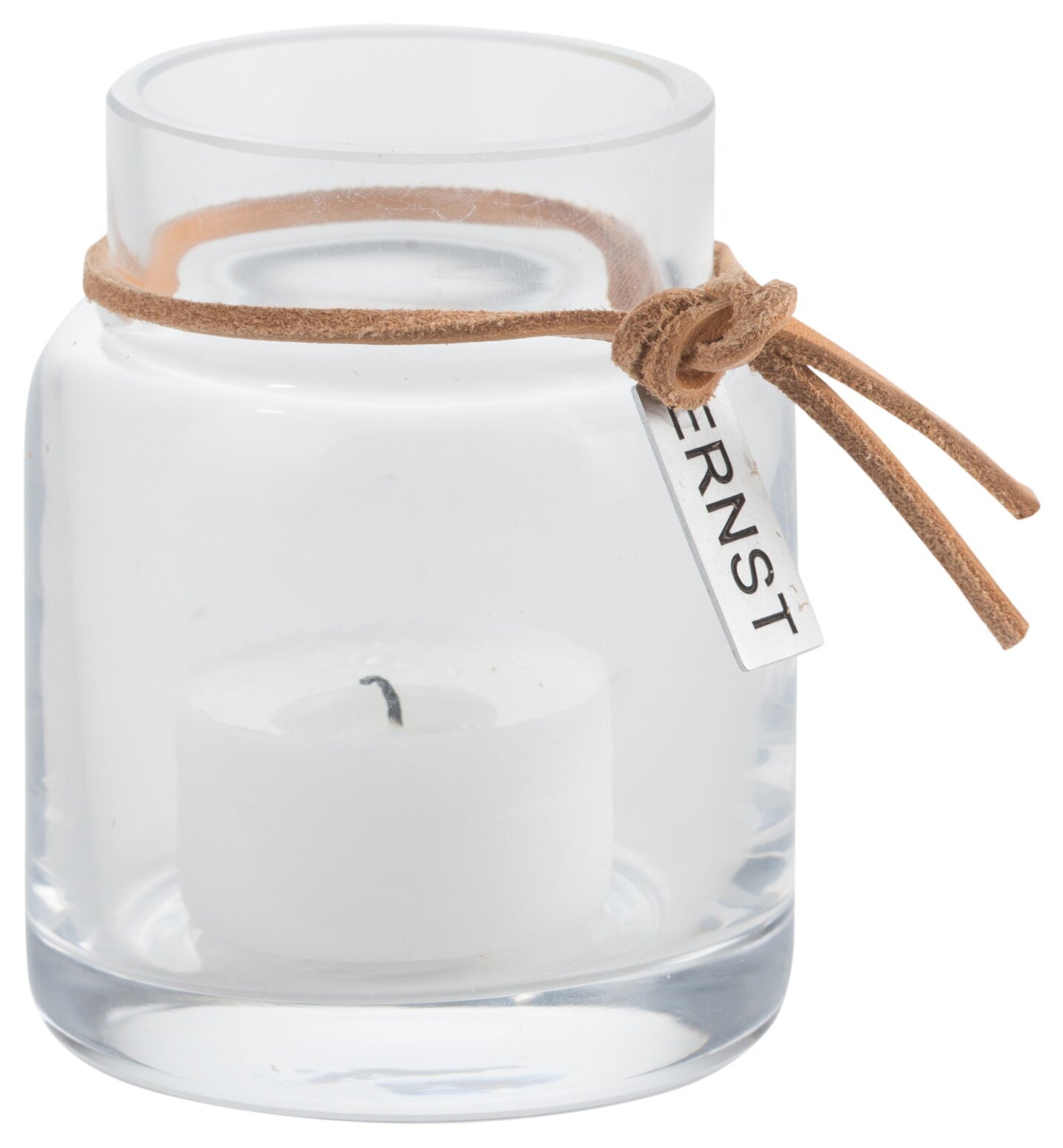 En särskild detalj är det bruna läderbandet som är knutet runt mynningen av lyktan. Det ger produkten en rustik känsla och kontrasterar mot det kalla glaset. På läderbandet hänger en liten metallbricka med varumärket Ernst ingraverat, vilket ger ett personligt och unikt inslag. Brickan skapar en intressant detalj samtidigt som den förstärker produktens identitet.