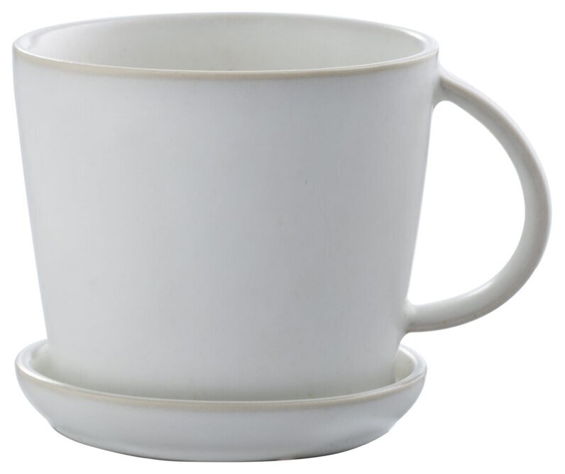 Bilden visar en tekopp med fat från varumärket Ernst, tillgänglig hos Köpstaden.se. Tekoppen är tillverkad i keramik och har en mjuk, vit nyans som ger ett stilrent intryck. Koppens form är cylindrisk med en behaglig bredd som ligger bekvämt i handen. Den är försedd med ett robust handtag som har en rundad utformning, vilket gör den lätt att greppa.