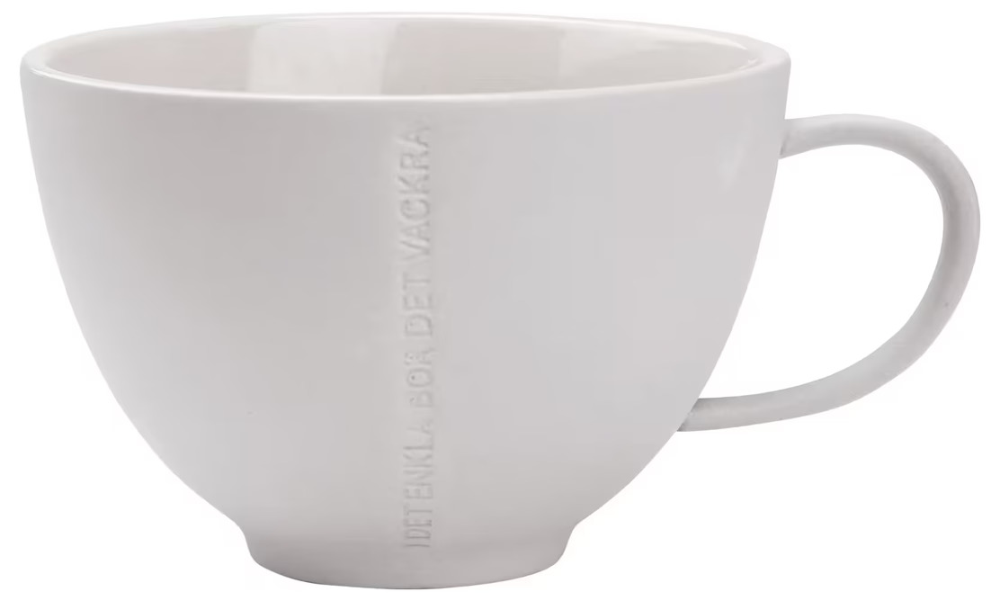 Vacker vit tekopp i stengods med texten - I det enkla bor det vackra. Tål maskindisk. Mått: Ø 12,5 x 7,8 cm.