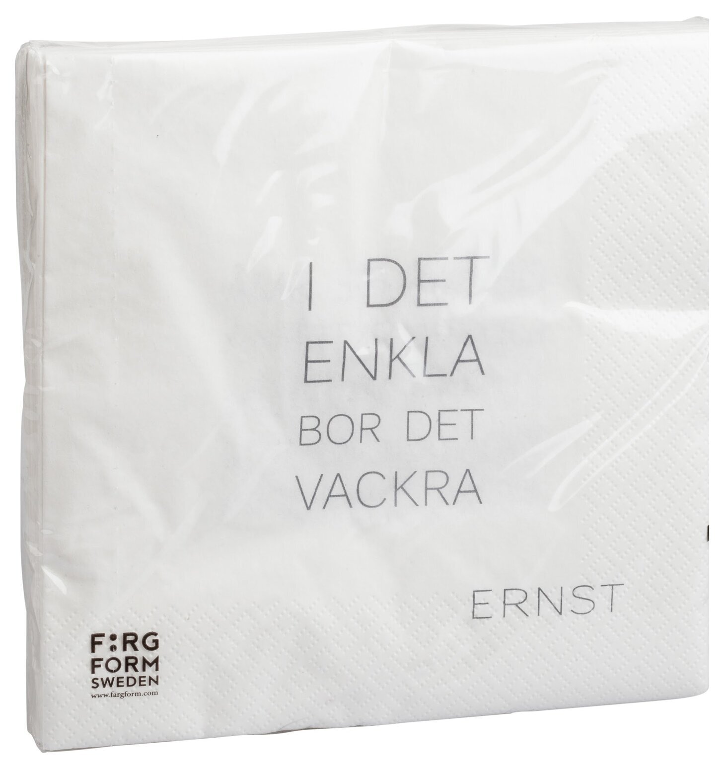 Förpackningen innehåller 20 stycken grå servetter med två citat. "I det enkla bor det vackra" & "Det är de små ljuspunkterna i vardagen som gör den stora skillnaden" Mått: 16,5 x 16,5 cm.
