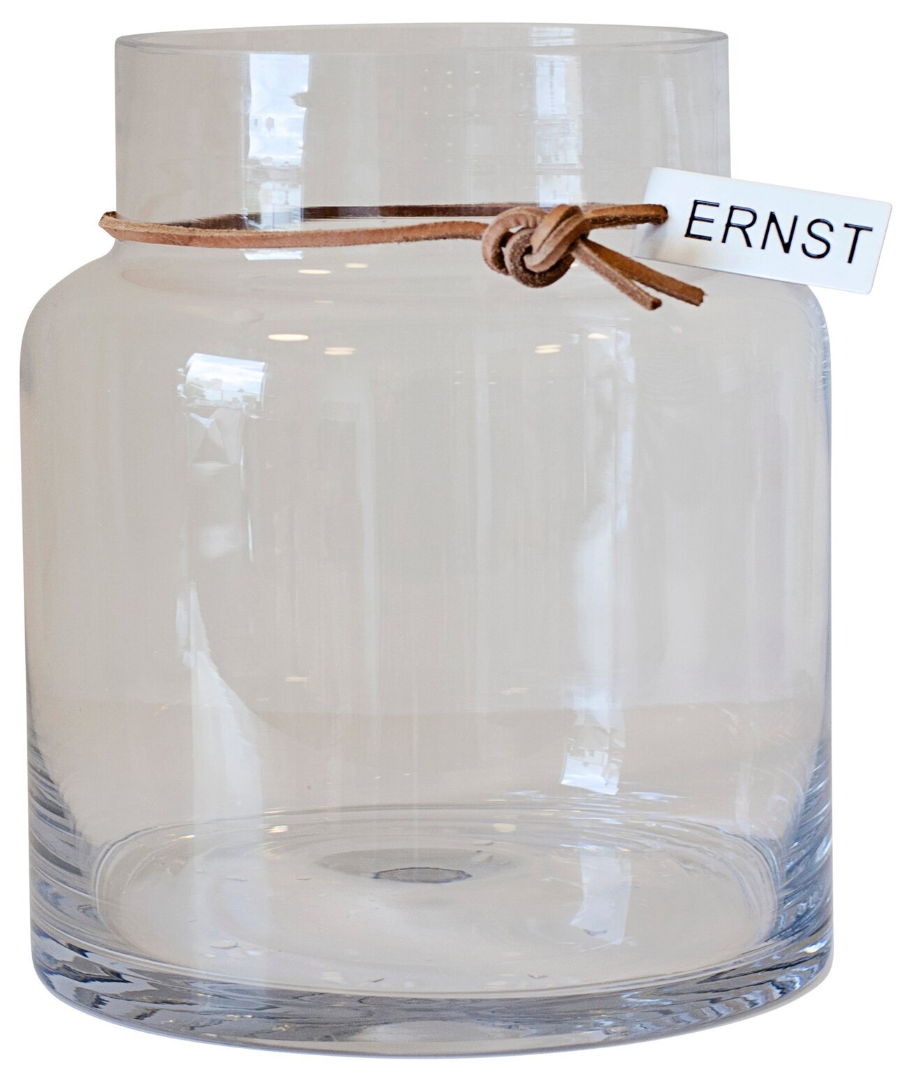 Snygg glasvas med läderband samt metallbricka graverat med Ernst. Mått: Ø 12. 5 x 22. 5 cm OBS - Tänk på att glasföremål som står i direkt solljus kan skapa solreflektioner. Läs mer