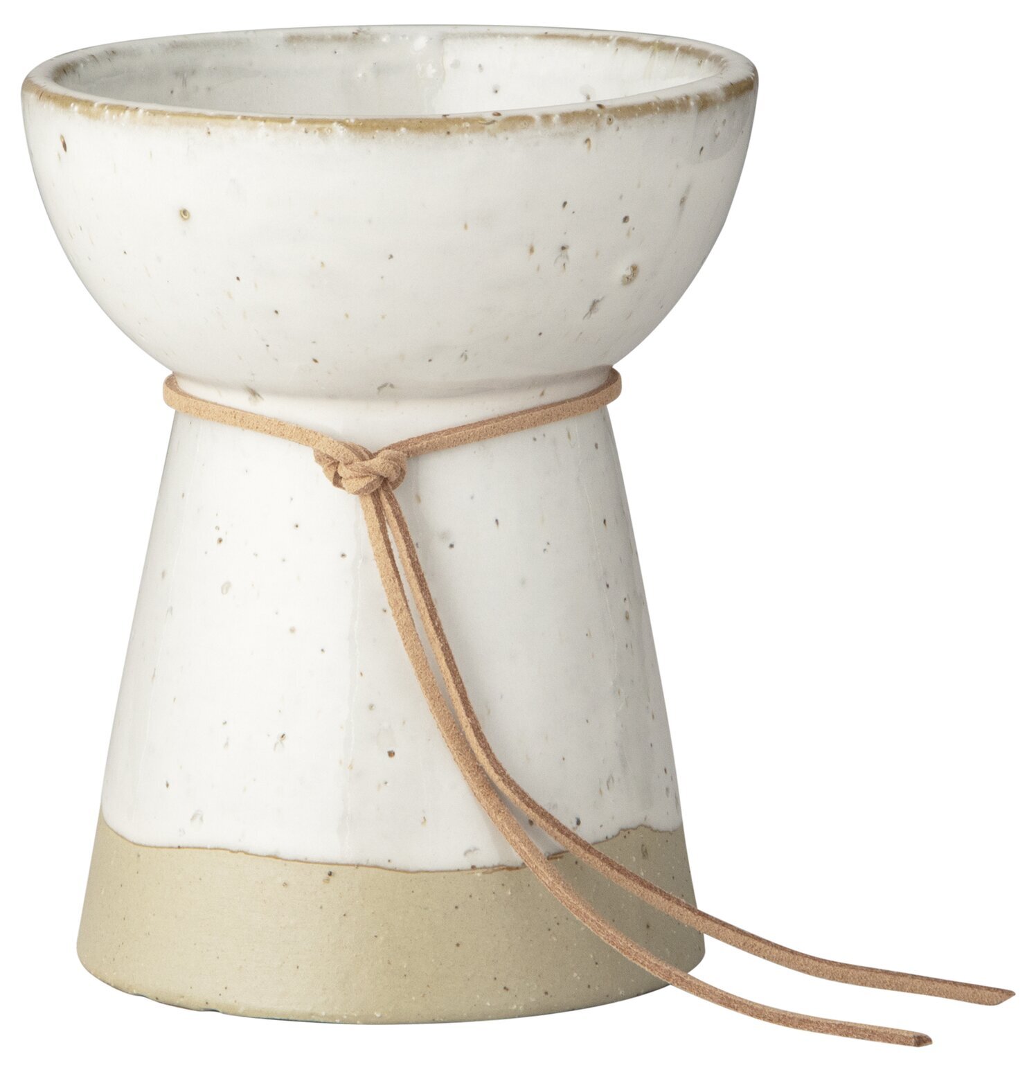 Ytan på stengodset är prickigt med små mörka fläckar som bryter upp den annars släta och enkla färgsättningen. Den nedre delen av vasen har en försänkt, matt yta som kontrasterar mot den glansigare övre delen. Färgskalan går från en varm beige vid basen till en mjuk krämig vit som dominerar mest av vasens kropp.