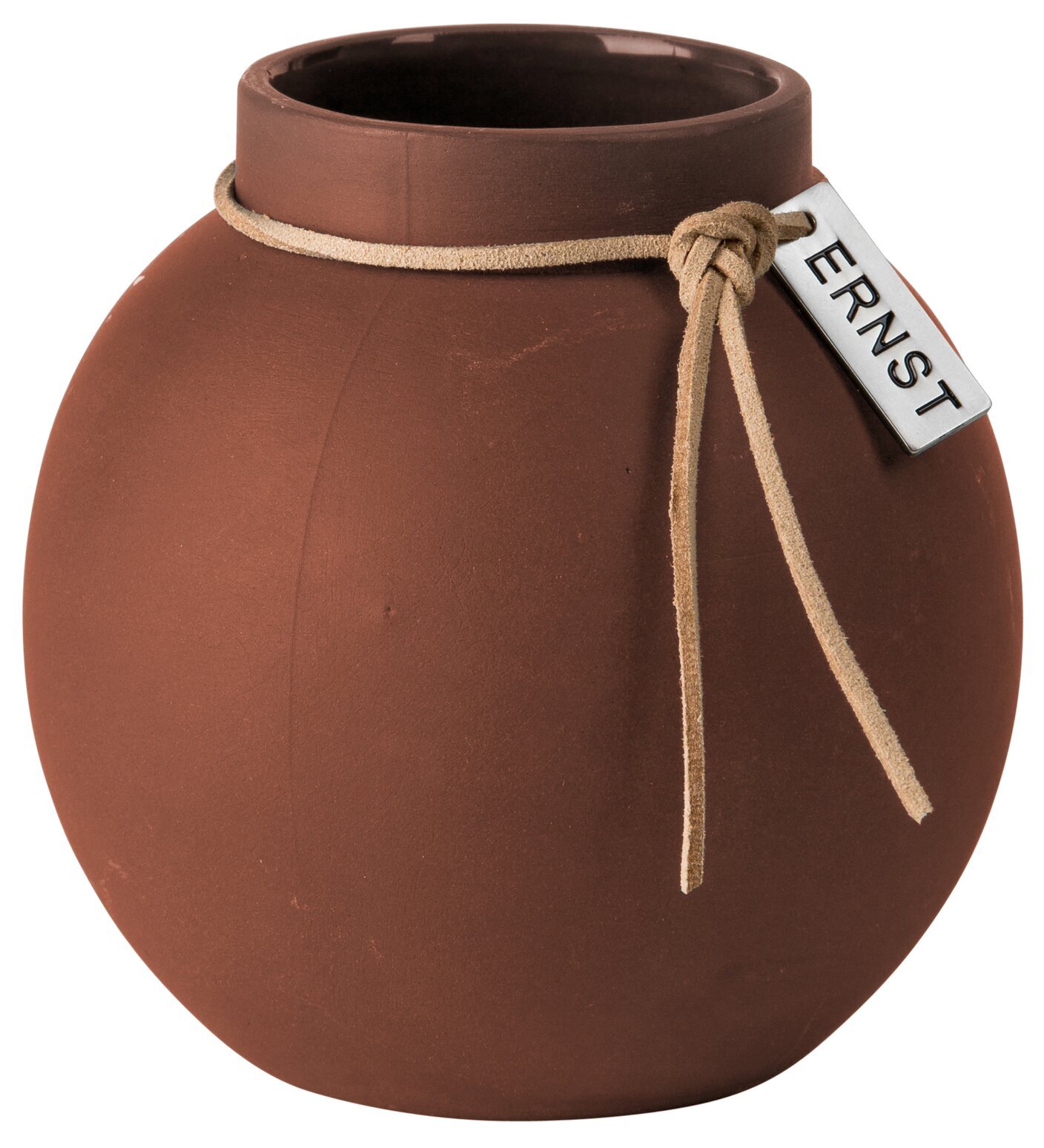 Runt halsen på vasen är ett tunt snöre av ljust läder knutet, vilket adderar en subtil detalj som bryter av mot den mörkare tonen på stengodset. Snöret är knutet på ett avslappnat sätt som ger ett okonstlat intryck. På snöret hänger en metallbricka där namnet "Ernst" står ingraverat, vilket tydligt visar produktens ursprung från det respekterade varumärket.