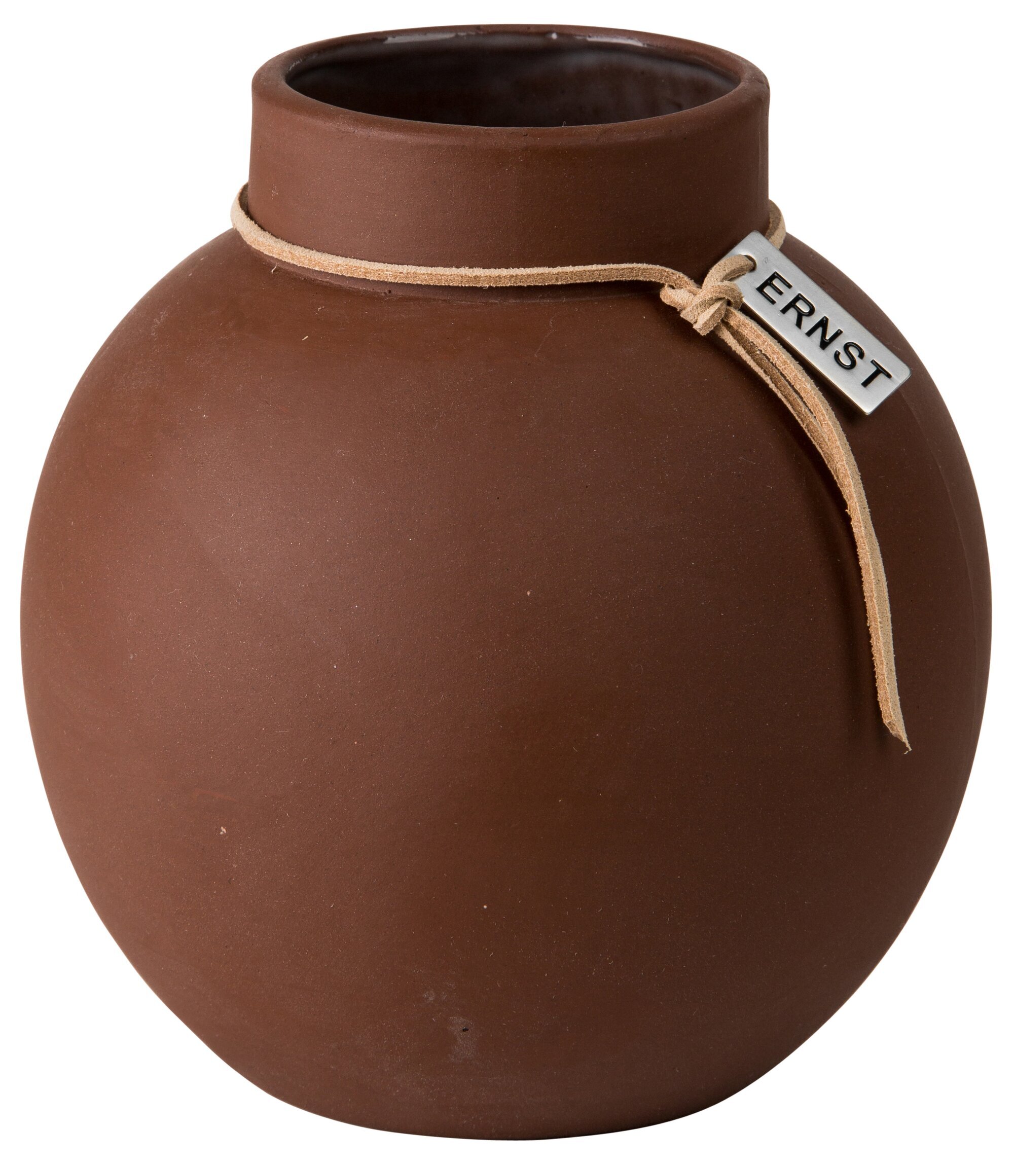Runt vasens hals löper ett tunt, ljust läderband som ger en fin kontrast till stengodsets mörkare ton. Detta band är enkelt knutet och avslutar med en diskret etikett där namnet på varumärket Ernst är präglat. Bandets placering och utformning är både dekorativ och kan också fungera som en subtil men elegant märkning av vasens ursprung och tillverkare.