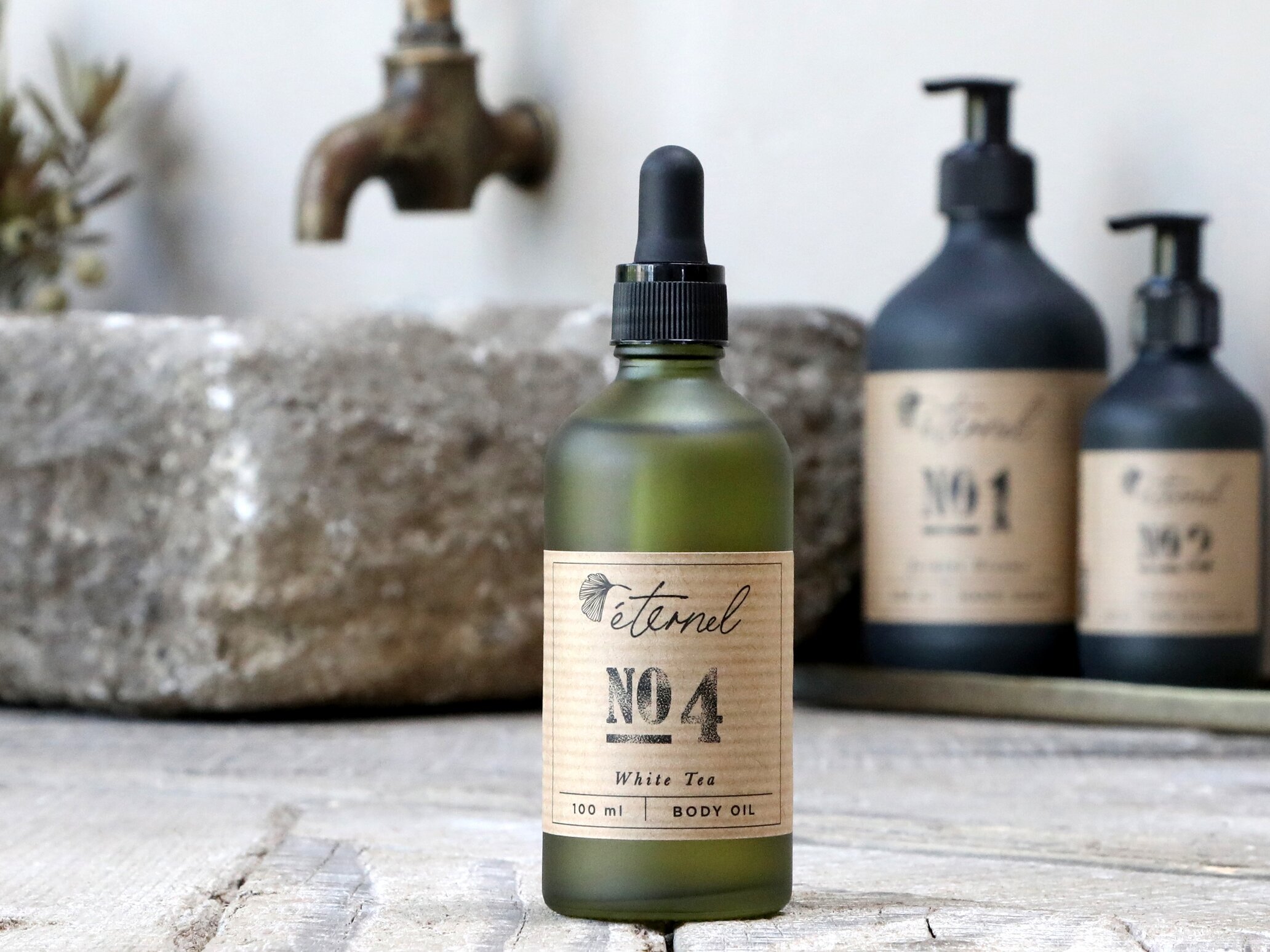 Bilden visar en produkt från Köpstaden.se, en nätbutik som tillhandahåller ett brett sortiment av produkter för vardagen. Den avbildade produkten är Eternel Body Oil No.4, som syns i förgrunden av bilden. Flaskan är gjord av glas med en grönaktig nyans och har en etikett i en naturlig, beige ton. På etiketten framgår varumärket Eternel och produktnamnet stilfullt tryckt i svart text. Under texten kan man urskilja beskrivningen "White Tea" som indikerar oljans doft eller huvudbeståndsdel.