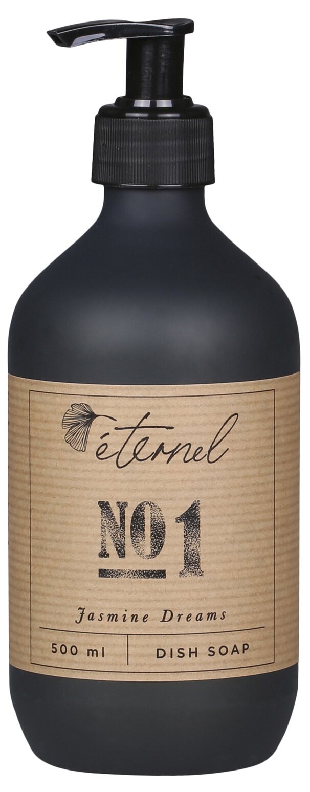Diskmedlets namn, No.1, står stolt under varumärket Éternel i en större och mer framträdande stil som nästan påminner om en klassisk stämpel, vilket kan förstärka intrycket av en exklusiv produkt. Under detta namn finns texten "Jasmine Dreams", vilket antyder att diskmedlet lämnar en subtil doft av jasmin. Denna text är skriven i en mindre och mer diskret stil.