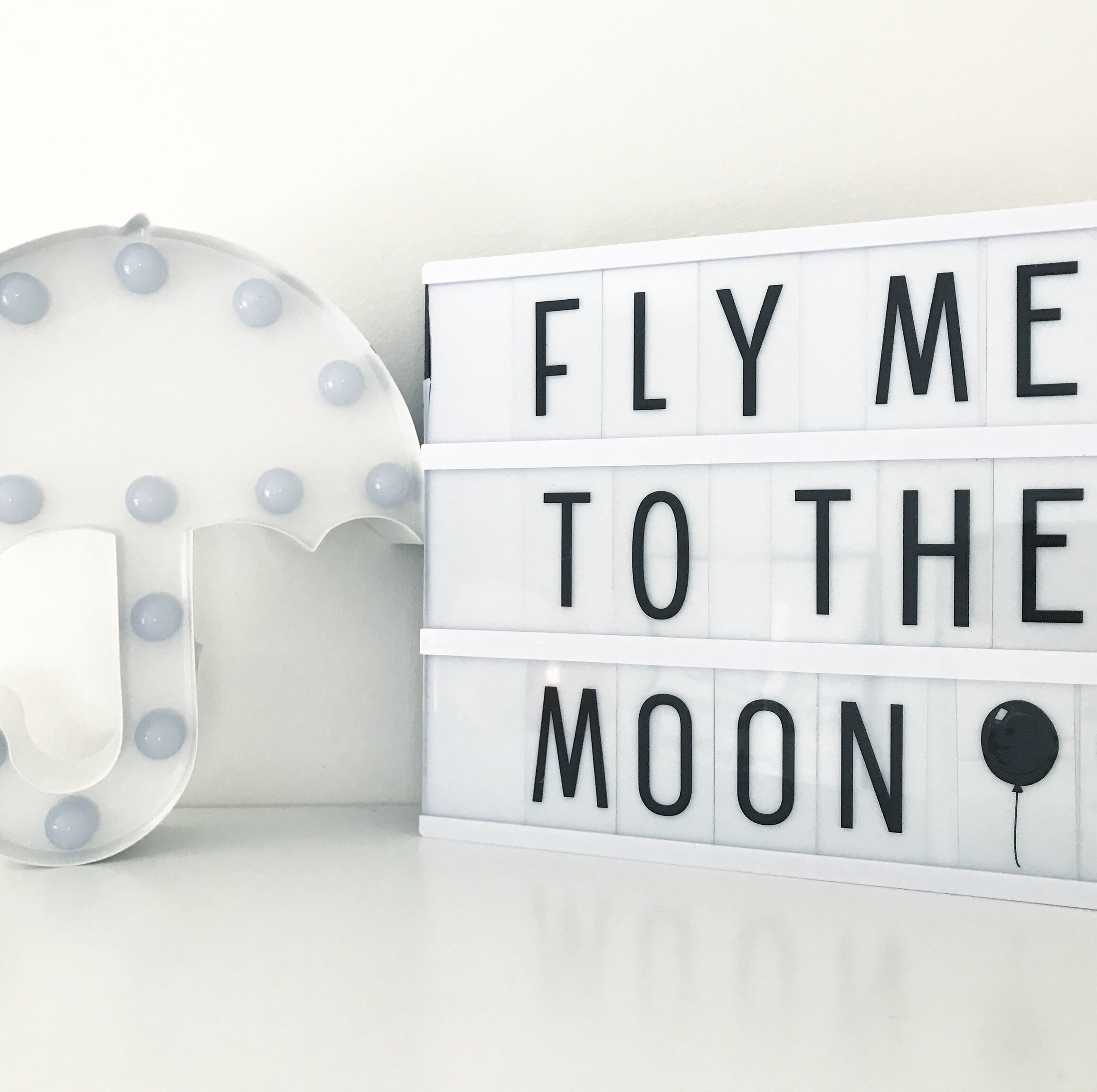 Bredvid paraply-lampan finns en ljuslåda med text, där de stora, svarta bokstäverna tydligt stavar ut "FLY ME TO THE MOON". Texten på ljuslådan är centrerad och lätt att läsa, vilket gör den till ett effektivt dekorativt element för att sätta personlig prägel på ett utrymme. Ljuslådan i bilden har en bakgrund i vitt, vilket kontrasterar snyggt mot den mörka texten och ger en klar och kontrastrik bild. Till höger om texten syns en liten, enkel ballondekor som bidrar med en lekfull touch.