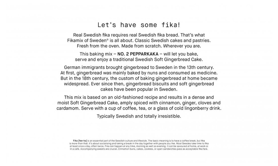 Bakmixen baseras på ett klassiskt gammaldags svenskt recept. Resultatet blir en saftig aromatisk kaka med riklig smak av kanel, ingefära, nejlika och kardemumma. Mixen ger två mjuka kakor, totalt ca 16 bitar.