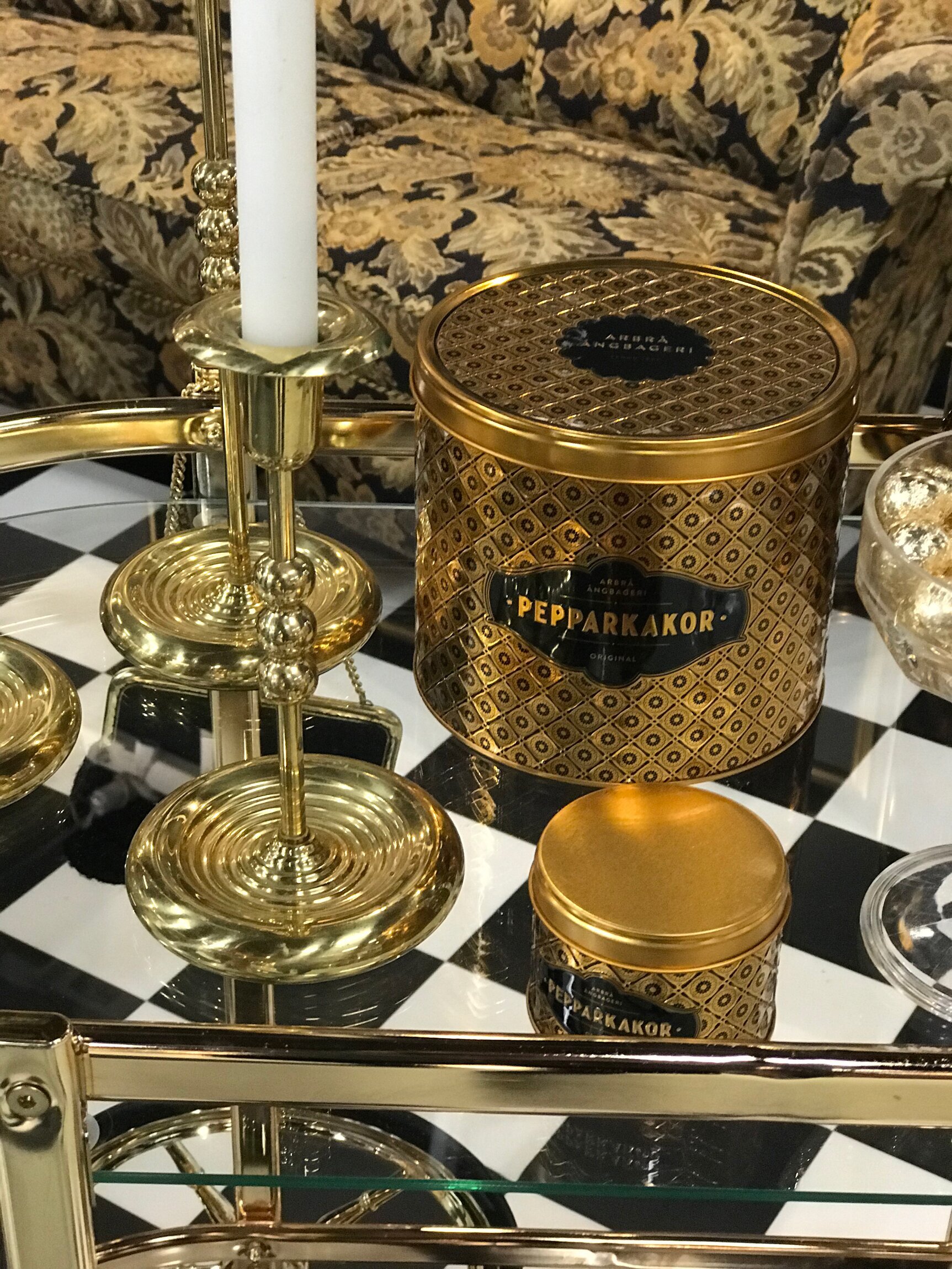 Bilden fångar en elegant inredningsscenario där en del av Köpstaden.se's breda produktsortiment finns representerat. På bilden ser vi två guldfärgade burkar från Finsmakeriet, märkta med pepparkakor. Dessa är strategiskt placerade på ett glasbord med en ram av glänsande metall, vilket harmonierar med burkarnas detaljrika design. Mönstret på burkarna är ett intrikat geometriskt motiv som förstärker känslan av lyxighet och finess.