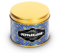 På bilden ser vi en cylindrisk burk som tillhör produkten Pepparkakor Miniburk Kungligt Blå från varumärket Finsmakeriet, vilken erbjuds på den mångsidiga butiken Köpstaden.se. Burken är utformad med en attraktiv blå basfärg, dekorerad med ett livfullt mönster som för tankarna till klassiska, kungliga designstilar. Mönstret består av återkommande geometriska former i olika nyanser av blått, med inslag av gyllene detaljer som skapar en fin kontrast och ger burken en unik estetisk känsla.