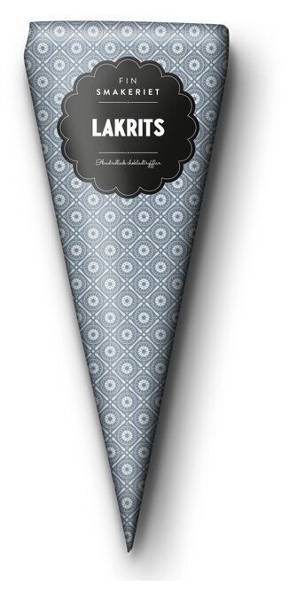 Bilden visar ett smakfullt förpackat paket från Finsmakeriet, en producent som erbjuder högkvalitativa delikatesser. Produkten, Chokladtryffel Lakrits, är förpackad i en elegant konformad påse. Den gråblå bakgrunden pryds av ett subtilt, repetitivt mönster som består av små, vita geometriska former, vilket ger förpackningen en stilren och attraktiv framtoning. Ett svart cirkulärt märke pryder framsidan, där både varumärkets och produktens namn framhävs i vita bokstäver – Finsmakeriet och ordet Lakrits syns tydligt.