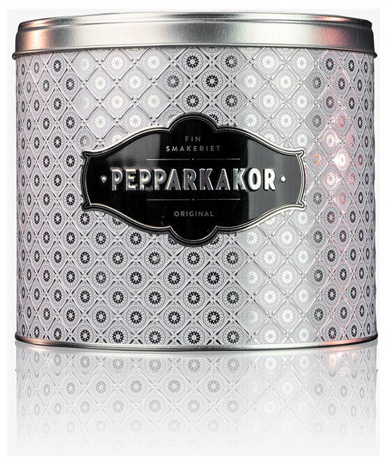 Bilden visar en stor, rund metallburk från Köpstaden.se. Denna burk, som innehåller produktnamnet Pepparkakor Vit 430 G från varumärket Finsmakeriet, har en elegant och genomtänkt design. Framträdande är den glänsande silverfärgade ytfinishen, som täcks av ett intrikat mönster av små, symmetriska diamanter. Varje diamant innehåller en detaljrik, blommönstrad cirkel som tillsammans skapar ett enhetligt och dekorativt utseende.