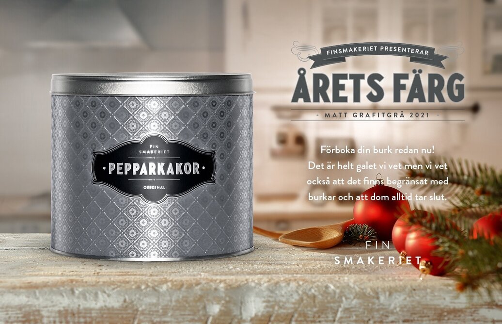 På höger sida av bilden finns ett markant stiliserat budskap som anger att produkten presenteras i "Årets färg" – matt grafitgrå för år 2021. Härmed framhävs burkens exklusivitet och det aktuella färgvalet. Texten i denna del är uppbyggd i modern, elegant typografi och belyser att burken finns i begränsad upplaga, vilket skapar en känsla av brådskande och exklusivitet för potentiella kunder.