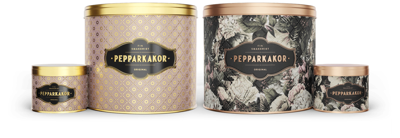 På bilden ser vi två distinkta burkar från varumärket Finsmakeriet, tillgängliga hos Köpstaden.se. Dessa burkar är designade för att rymma pepparkakor och de visar upp en stilfull förpackning som fångar uppmärksamheten.