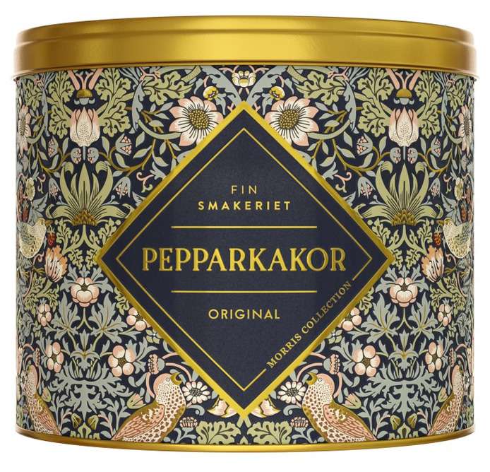 Ångbakade pepparkakor förpackade i en vacker plåtburk med mönster Strawberry Thief från William Morris. Läs mer