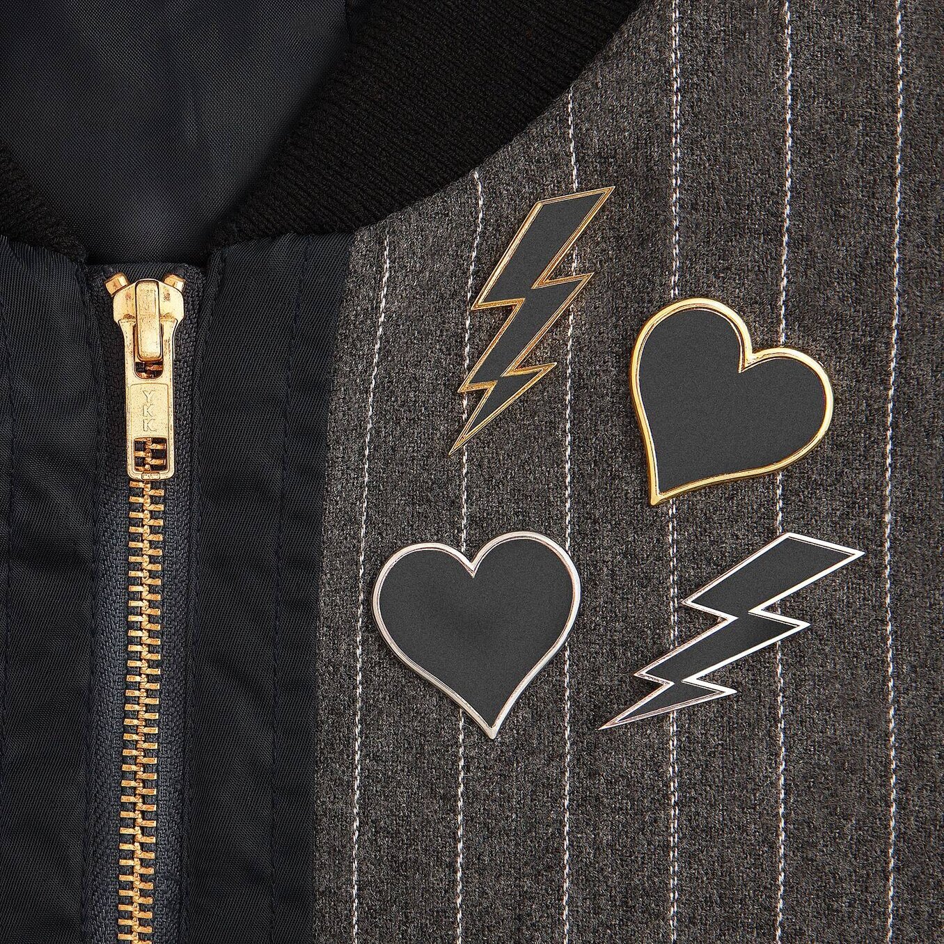 Fräcka reflex-pins som fästes med en nål på jackan, ryggsäcken eller barnvagnen. De kommer i ett set med en blixt och ett hjärta & finns i silver & guld. Jättefina att ha ihop eller att användas var för sig. Tänk på att nålen gör ett litet hål i tyget när den sticks in. Material: Silverfärgad metall med svart 3M reflexmaterial. Mått: 3-4 cm.